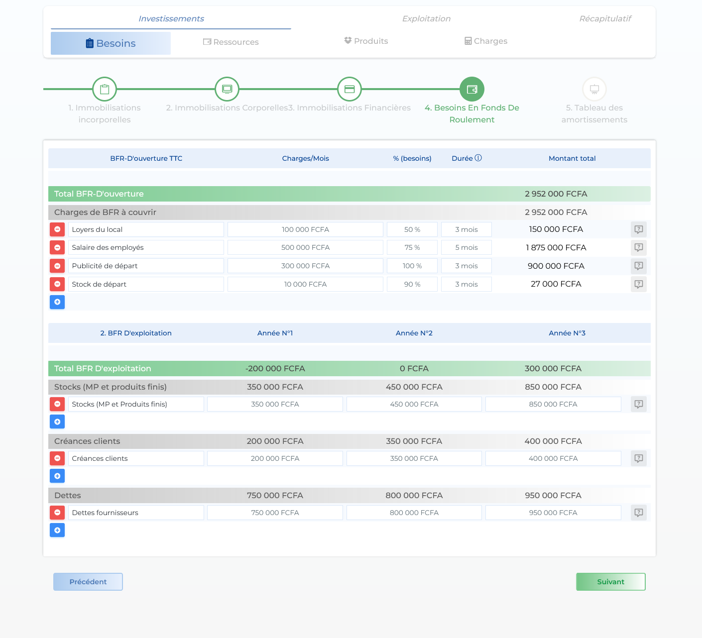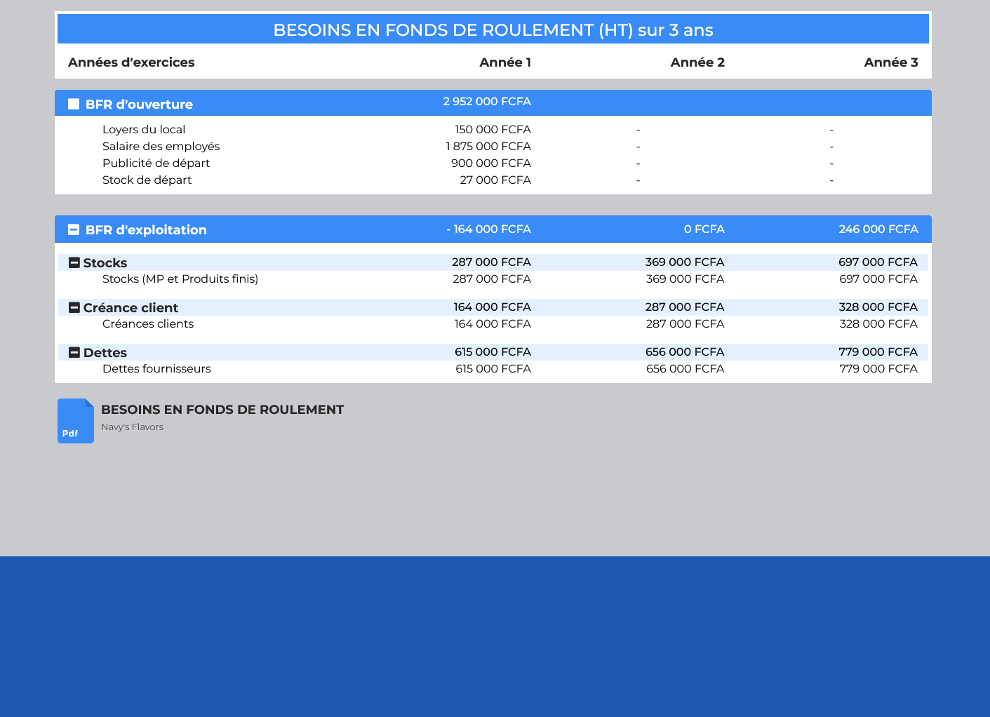 Besoin en fonds de roulement : Cette partie évalue les besoins de liquidités de l'entreprise pour couvrir ses dépenses opérationnelles courantes, telles que les stocks, les créances clients et les dettes fournisseurs. Le besoin en fonds de roulement est crucial pour maintenir l'activité et assurer une gestion financière saine.