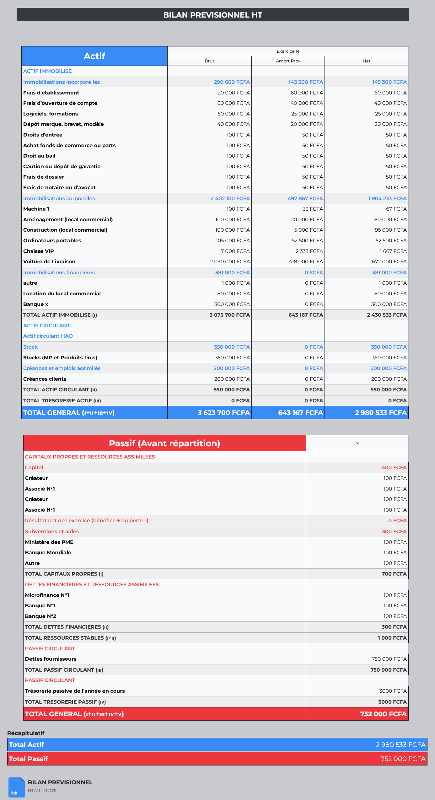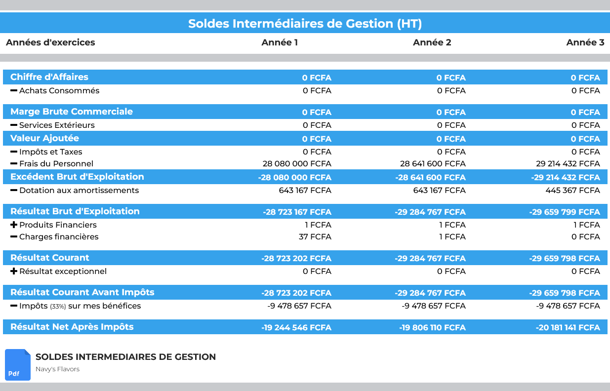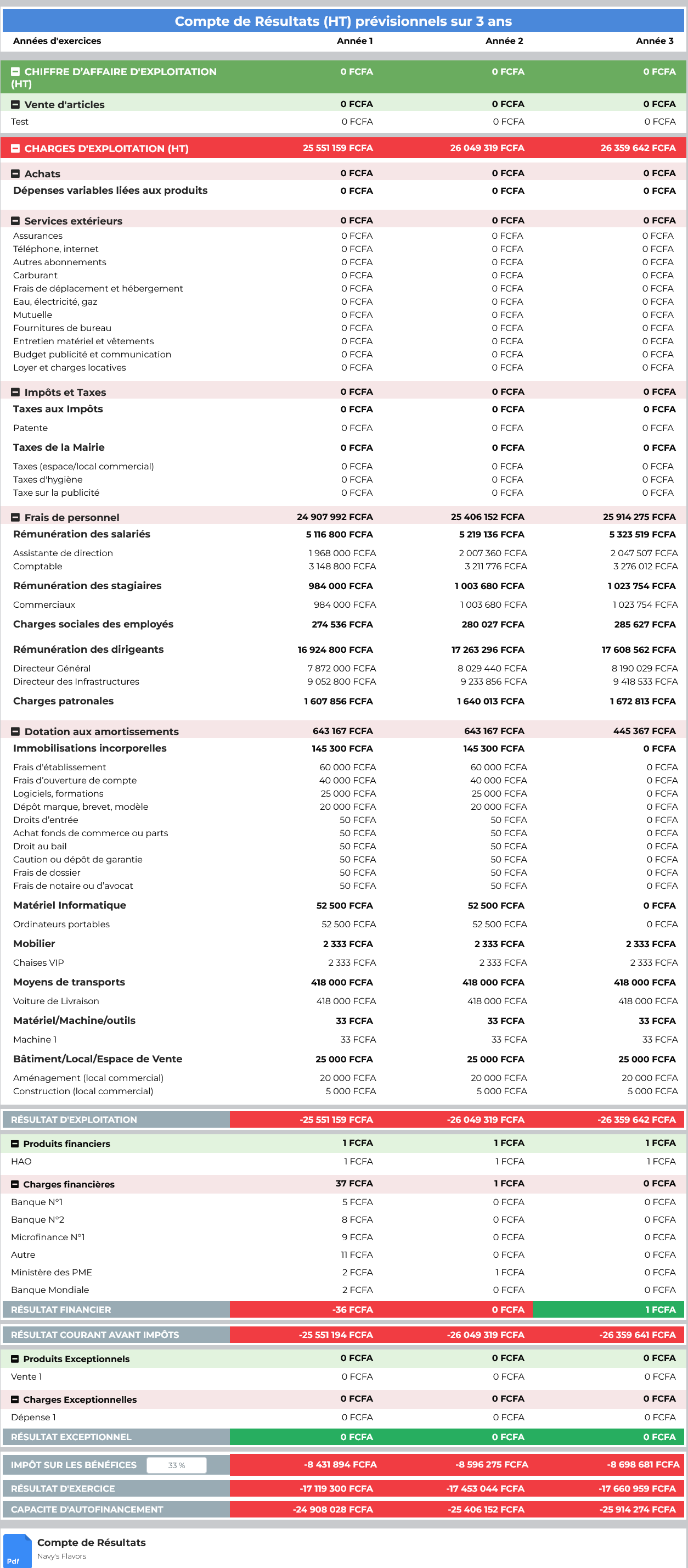 | Impôt sur les bénéfices | Résultat avant impôt * Taux (valeur par défaut 33%) |