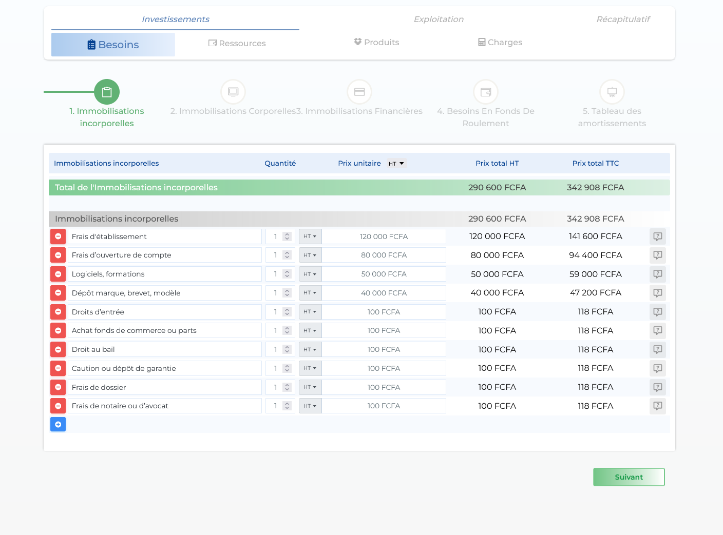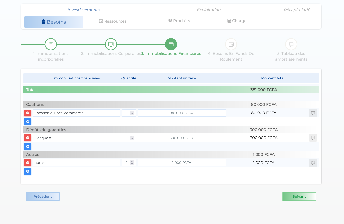 1- Besoins : Sous champs de saisie pour énumérer la liste des besoins financiers nécessaires au démarrage de l’activité.