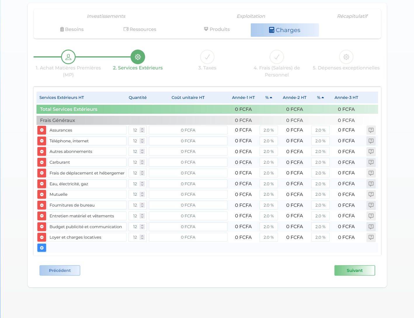 Sur ce tableau, vous devez renseigner toutes vos charges d’exploitation. C'est-à-dire toutes vos charges mensuelles. Ces charges mensuelles concernent entre autres: le loyer, l’électricité, l’eau, l’abonnement internet etc…