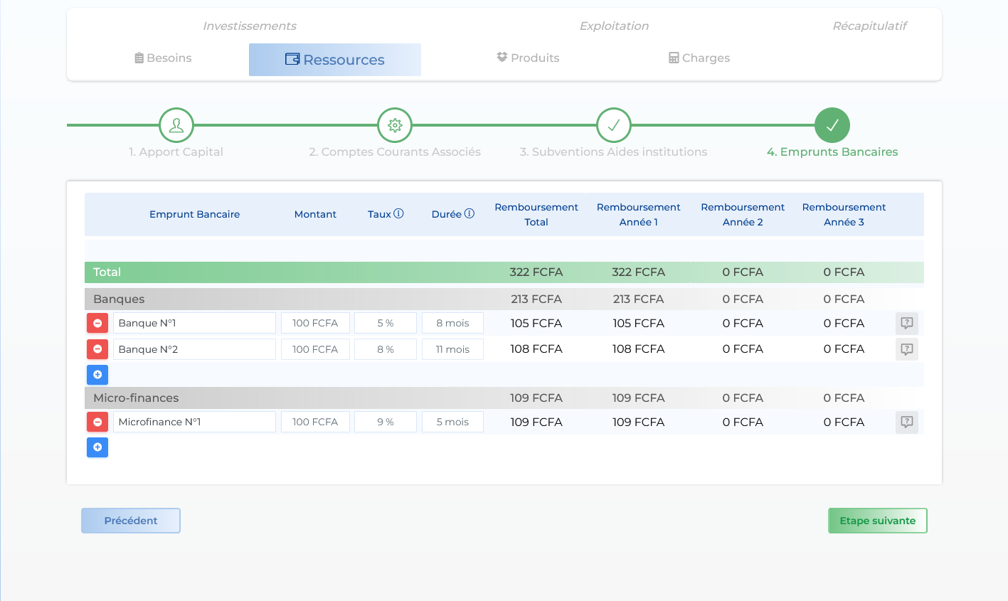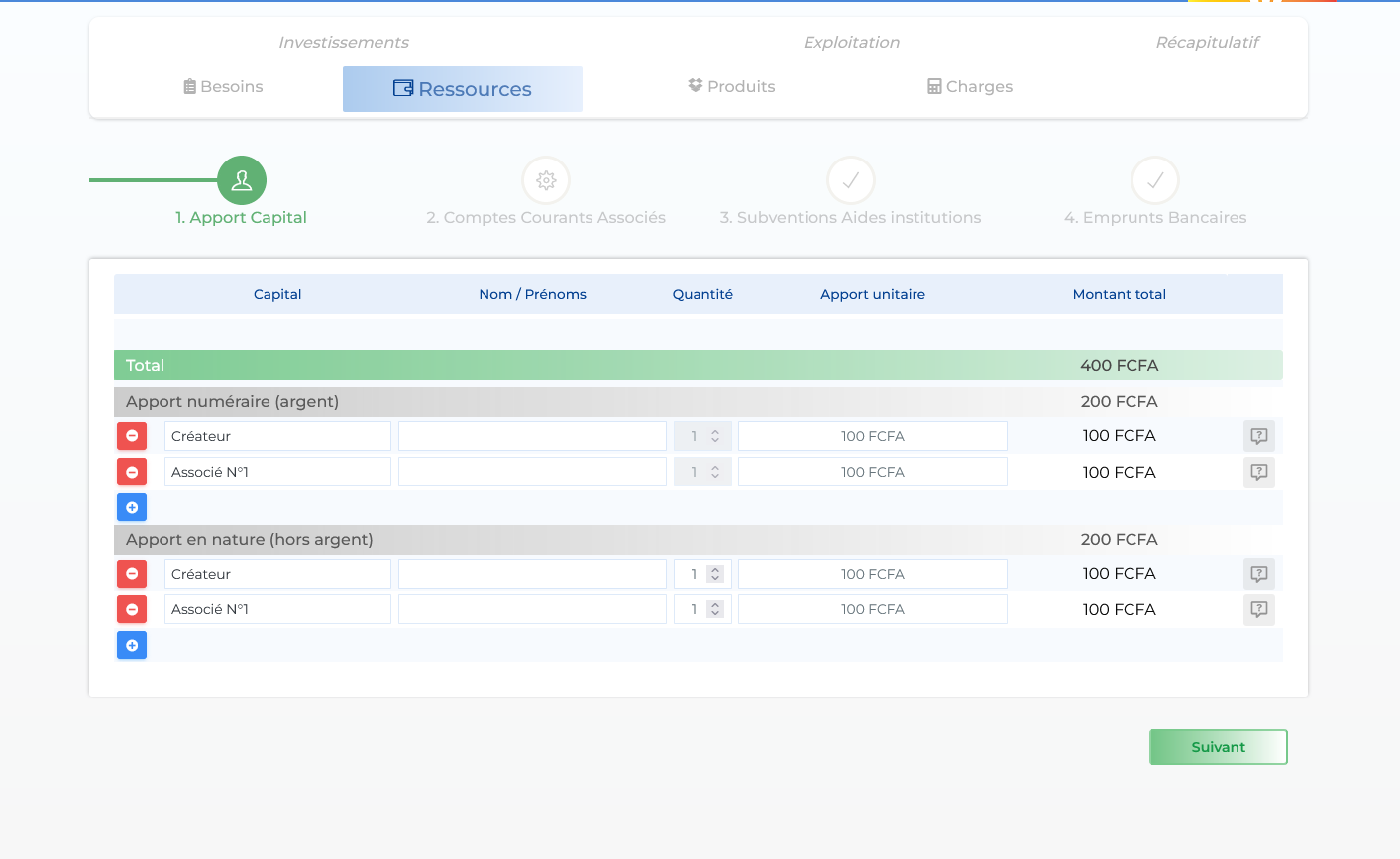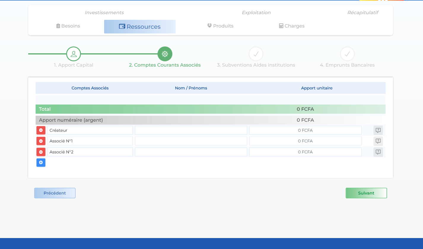 2- Ressources : Sous champs de saisie pour le renseignement de vos avoirs financiers, l’argent dont vous disposez afin de démarrer l’activité.