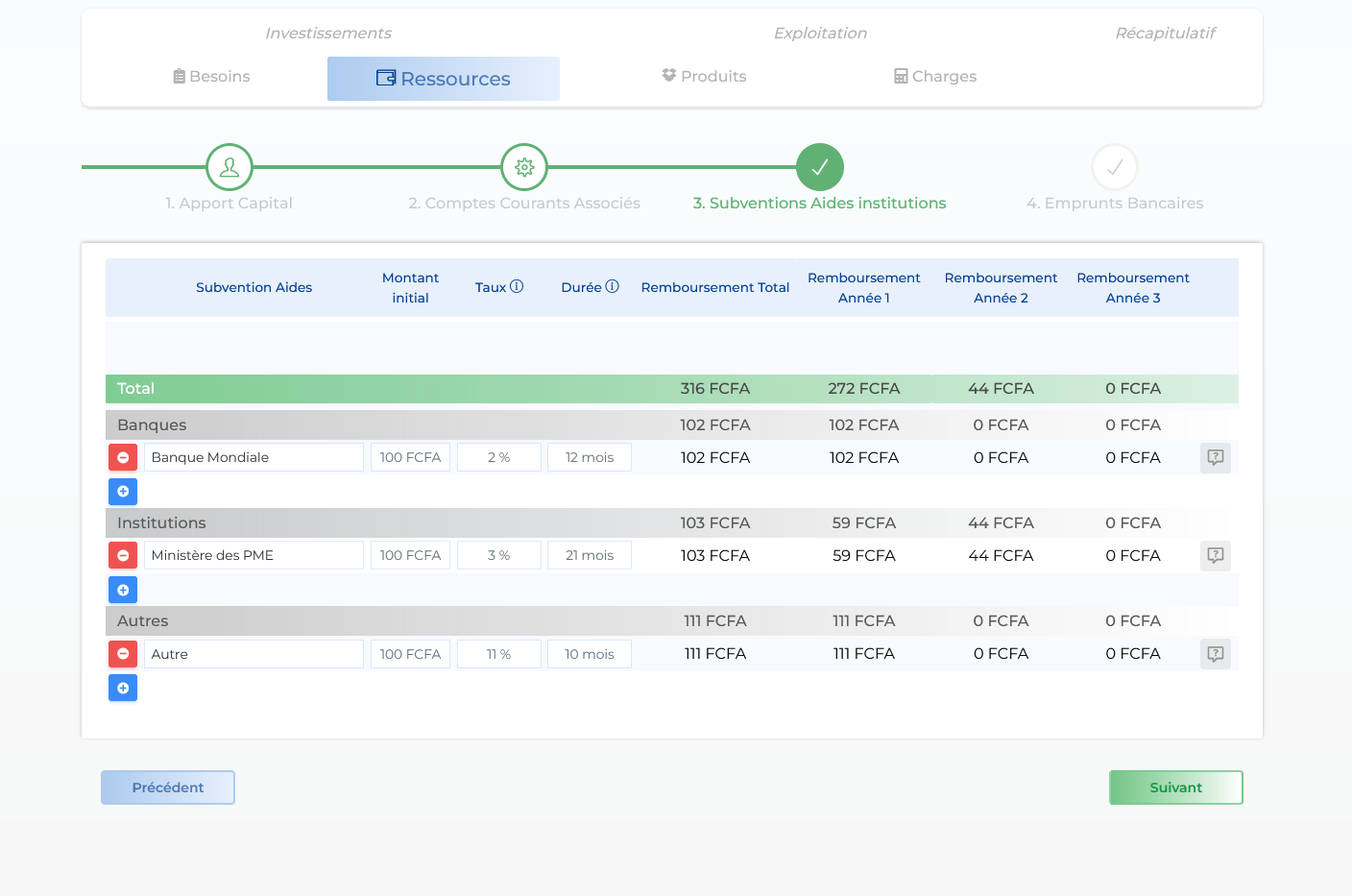 Ces subventions peuvent venir de plusieurs partenaires tels que les Banques (Banque Mondiale…), des institutions (Ministères, PNUD, FAO, OIF, Ambassades…), ou d’autres qu’il faudra préciser dans la section Autres.
