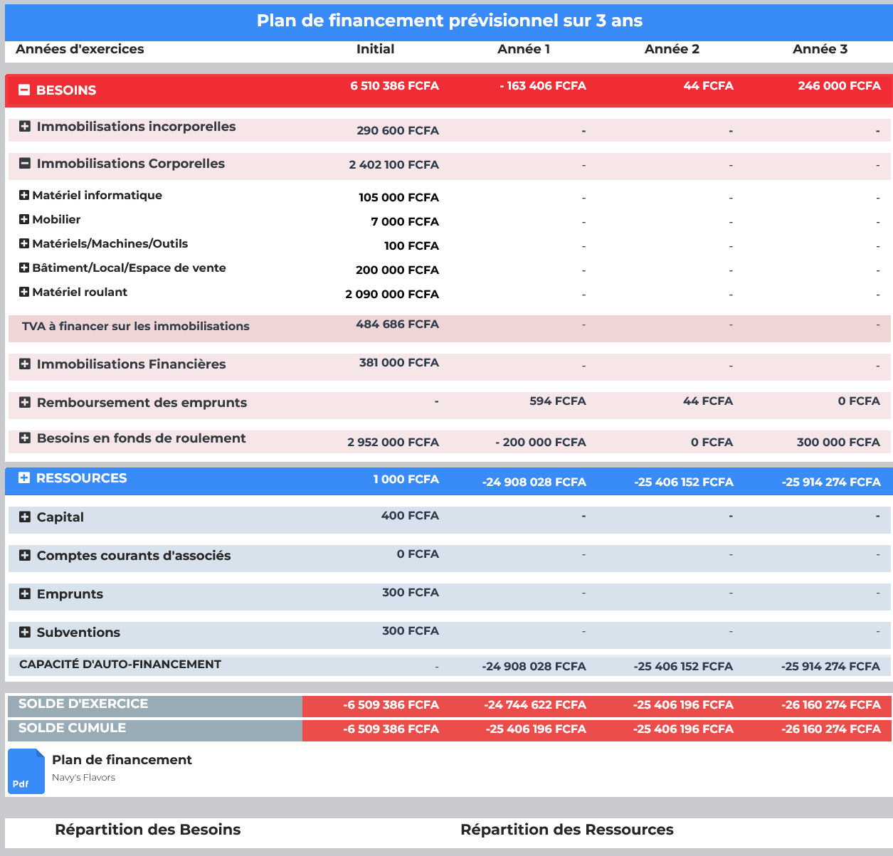 Notre Plan de financement se compose de deux grands tableaux, les besoins et les ressources ainsi que d’un tableau moins riche qui présente le solde d’exercice et le solde cumulé.