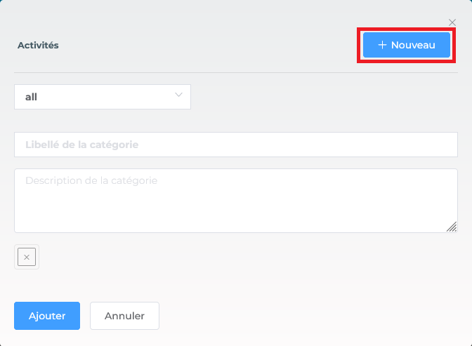 l'espace constitue ainsi l’environnement où l’on retrouve généralement les activités qui sont créées. Saisissez le nom de la catégorie dans le champ "Libellé de la catégorie". Ce libellé doit être clair et descriptif pour faciliter la reconnaissance de l'activité.
