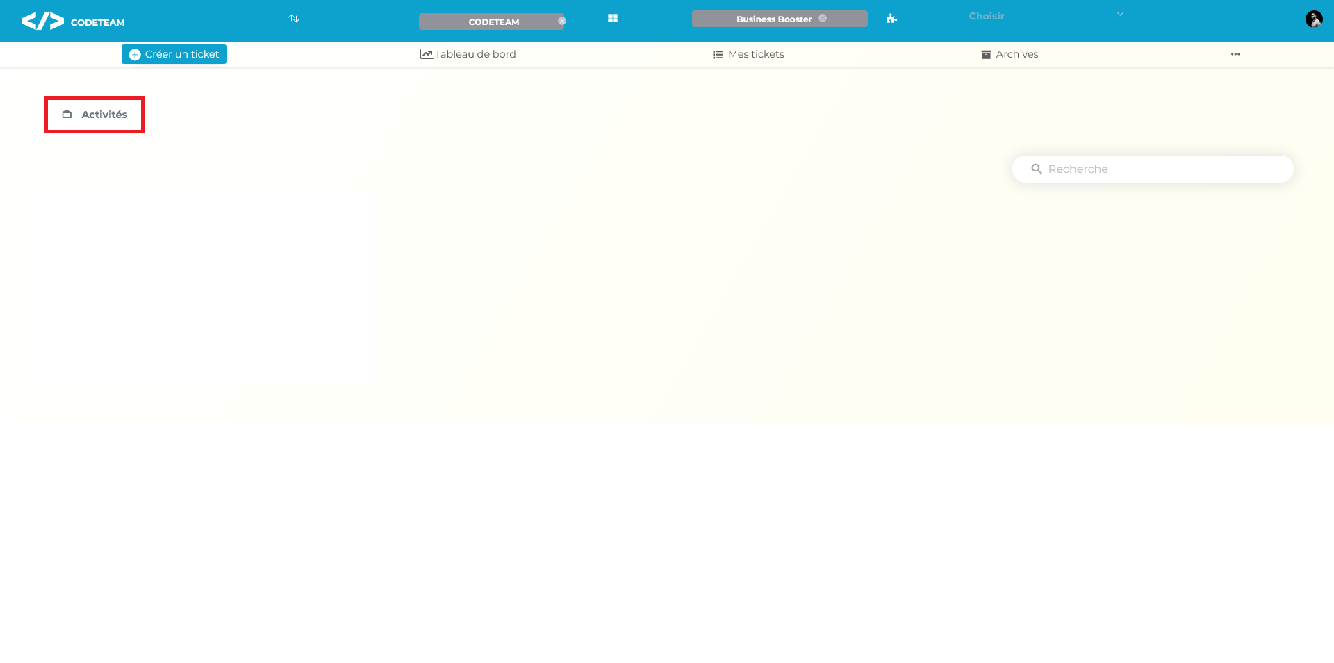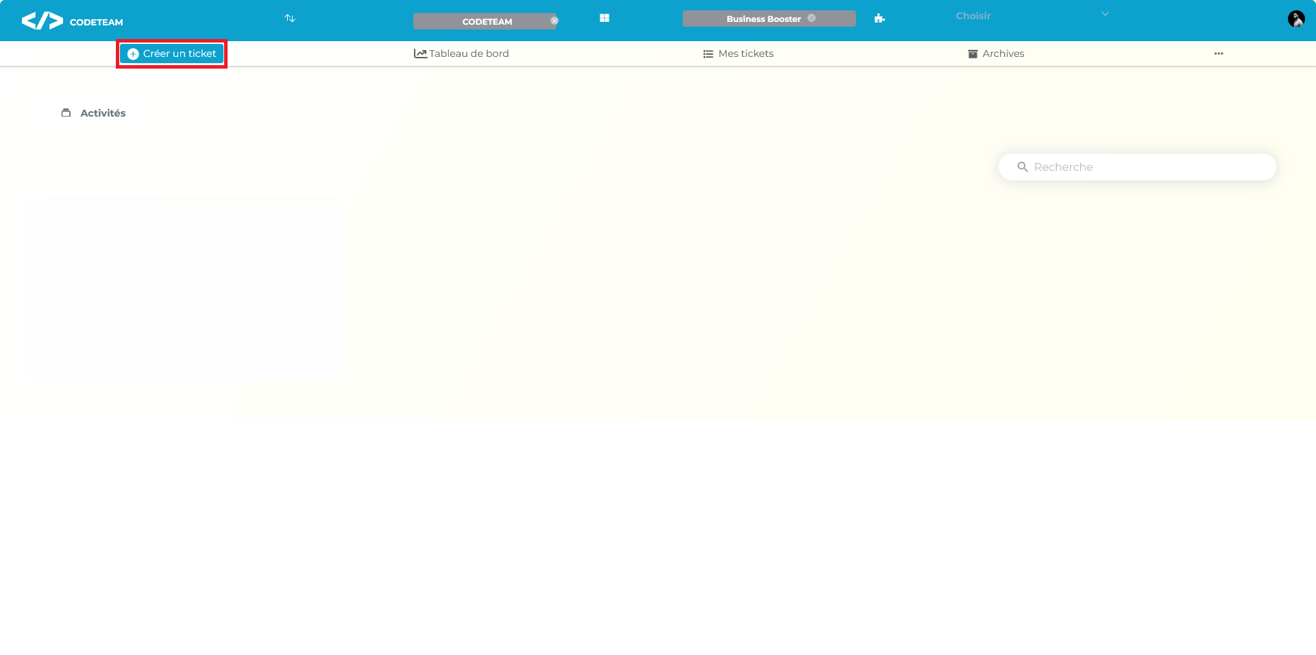 La fonctionnalité de création d'une activité permet aux utilisateurs de pouvoir créer des tickets autrement appelés tâches. Pour procéder à la création de votre activité. Veuillez juste cliquer sur le bouton Activités.