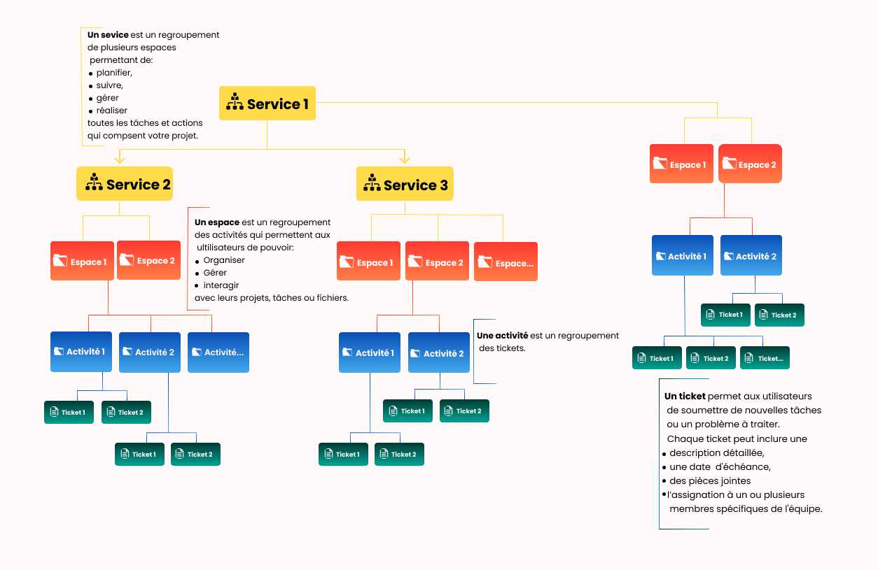 Un ticket permet aux utilisateurs de soumettre de nouvelles tâches ou de signaler un problème à résoudre. Chaque ticket peut contenir une description détaillée, une date d'échéance, des pièces jointes, ainsi que l'assignation à un ou plusieurs membres spécifiques de l'équipe.